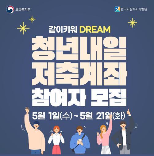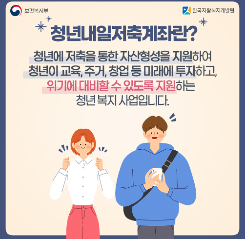 청년내일저축계좌는 청년 근로층에게 저축을 통한 자산형성을 지원 사업으로 청년이 미래를 위해 주거, 교육, 창업, 등 투자할 수 있도록 도움을 주는 한편 위기에 대비할 수 있도록 지원하는 청년 자산형성 지원 복지 사업입니다.