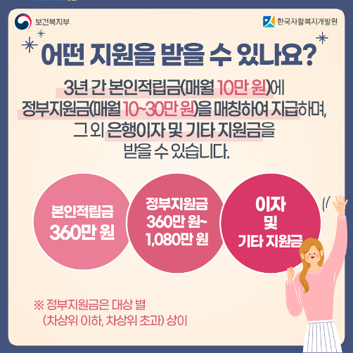 -정부지원금 3년간 총 360만원 ~ 1,080만 원까지 적립[정부지원금은 대상별 상이]