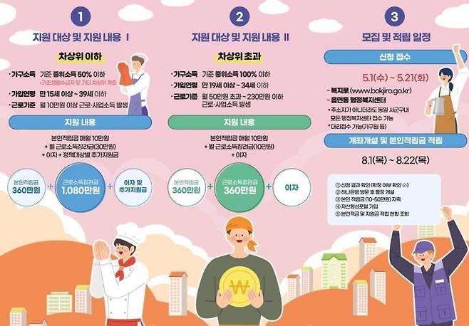 -3년간 근로활동을 통해 본인 적립금[매월10만 원]에 정부지원금[매월 10만원 ~ 30만 원]을 추가로 지급하며, 그 외 은행이자와 지원금을 받을 수 있습니다.